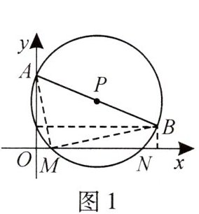 分别以点 $ A $, $ B $ 为圆心, 大于 $ \frac{1}{2}AB $ 的长为半径画弧, 连接两弧的交点与 $ AB $ 交于点 $ P $, 以点 $ P $ 为圆心, $ AB $ 为直径画圆, 圆与 $ x $ 轴的交点即为所求的点 $ M $, $ N $.