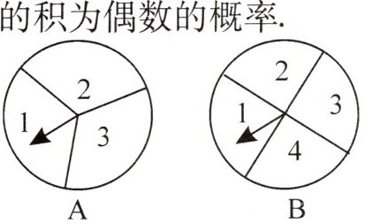 10. (2024·番禺区月考)如图是两个可以随机转动的转盘,转盘A的三个扇形面积相等,分别标有数字1,2,3,转盘B的四个扇形面积相等,分别标有数字1,2,3,4.转动A、B转盘各一次,当转盘停止转动时,将指针所落扇形中的两个数字相乘(当指针落在两个扇形的交线上时,视为指向指针向右的扇形).求两个数字的积为偶数的概率.
