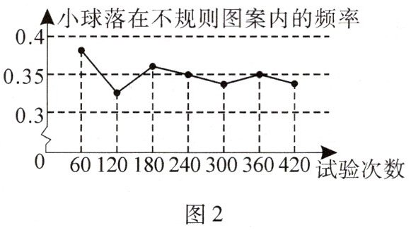 13. 如图1,平整的地面上有一个不规则图案(图中阴影部分),小明想了解该图案的面积是多少.他采取了以下办法:用一个长为8m、宽为5m的长方形,将不规则图案围起来,然后在适当位置随机向长方形区域内扔小球,并记录小球落在不规则图案上的次数(小球扔在界线上或长方形区域外不计入试验结果),他将若干次有效试验的结果绘制成了图2所示的折线统计图,由此可知不规则图案的面积大约是(