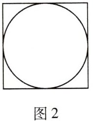 图 2 是一个正方形及其内切圆,随机地往正方形内投一粒米,落在圆内的概率为 $ P(A) = \frac{\text{圆的面积}}{\text{正方形的面积}} = \frac{\pi}{4} $.