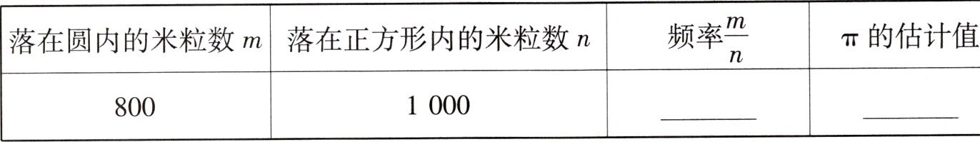 (1)随机撒一把米到画有正方形及其内切圆的白纸上,统计并计算落在圆内的米粒数 $ m $ 与正方形内的米粒数 $ n $ 的比 $ \frac{m}{n} $.