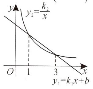 12. 在同一平面直角坐标系中,一次函数$y_{1}= k_{1}x+b与反比例函数y_{2}= \frac {k_{2}}{x}(x>0)$的图象如图所示,则当$y_{1}>y_{2}$时,自变量x的取值范围为(