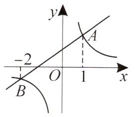 10. (2024·潮阳区一模)如图,一次函数$y_{1}= k_{1}x+b(k_{1}>0)$的图象与反比例函数$y_{2}= \frac {k_{2}}{x}(k_{2}>0)$的图象相交于A,B两点,点A的横坐标为1,点B的横坐标为-2.当$y_{1}≥y_{2}$时,x的取值范围