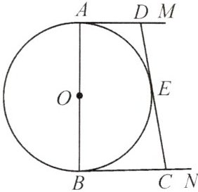 16. 如图,$\odot O的直径为AB$,$AM和BN$是它的两条切线,$DE切\odot O于点E$,交$AM于点D$,交$BN于点C$.