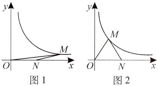 当 $ OM = ON $ 时,$ \triangle OMN $ 为等腰三角形,$ N(5, 0) $,过点 $ M $ 作 $ MB \perp ON $ 于点 $ B $,设点 $ M $ 的坐标为 $ (b, \frac{12}{b}) $。$\because OM = ON = 5 $,$\therefore$ 在 $ Rt\triangle OMB $ 中,$\sqrt{b^2 + (\frac{12}{b})^2} = 5 $,解得 $ b = 3 $ 或 $ b = 4 $(负值已舍去)。当 $ b = 3 $ 时,点 $ M $ 的坐标为 $ (3, 4) $,$\therefore OB = 3 $,$ MB = 4 $。$\therefore BN = 2 $。$\therefore MN = \sqrt{4^2 + 2^2} = 2\sqrt{5} $;当 $ b = 4 $ 时,点 $ M $ 的坐标为 $ (4, 3) $,$\therefore OB = 4 $,$ MB = 3 $。$\therefore BN = 1 $。$\therefore MN = \sqrt{3^2 + 1^2} = \sqrt{10} $。综上所述,$ MN $ 的长为 $ 2\sqrt{5} $ 或 $ \sqrt{10} $。