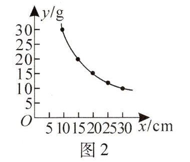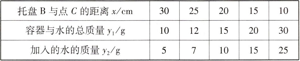 2. (2024·拱墅区校级期中)在实验课上,小明做了一个实验,如图$1$,在仪器左边托盘$A$(固定)中放置一个物体,在右边托盘$B$(可左右移动)中放置一个可以装水的容器,容器的质量为$5g$,在容器中加入一定质量的水,可以使仪器左右平衡,改变托盘$B与点C的距离x(cm)(0 < x \leq 60)$,记录容器中加入水的质量,得到表格: