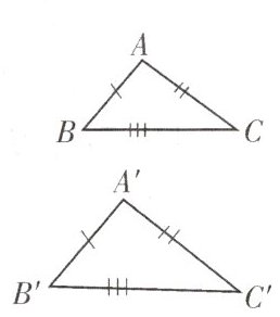 相等 $\frac {AB}{A'B'}=\frac {AC}{A'C'}=\frac {BC}{B'C'}$ $\triangle ABC\backsim \triangle A'B'C'$