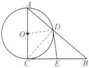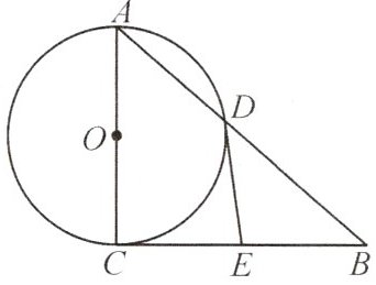 12. 如图,在$Rt△ABC$中,$∠ACB= 90^{\circ }$,以 AC 为直径的$\odot O$交 AB 于点 D,E 是边 BC 的中点,连接 DE.