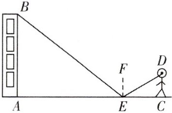 3. 如图,小强用镜面反射的方法来测量学校教学楼的高度. 他在地面E处放一面镜子,测得镜子与教学楼的距离$EA= 20$米,以及他与镜子的距离$CE= 2$米. 已知他的眼睛距离地面的高度$DC= 1.6$米,计算教学楼的高度为