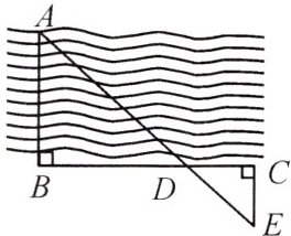1. 如图,为了估算河的宽度,我们可以在河对岸选定一个目标作为点A,在河的这一边选定点B和C,使$AB⊥BC$,然后,再选点E,使$EC⊥BC$,确定BC和AE的交点D. 此时,如果测得$BD= 120$米,$DC= 60$米,$EC= 50$米,求两岸间的大致距离AB.
