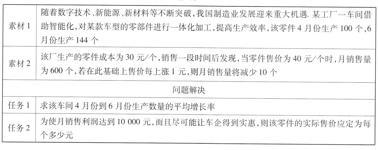 解:任务一:设车间 4 月份到 6 月份生产数量的平均增长率为 $ x $. 依题意,得 $ 100(1 + x)^2 = 144 $,解得 $ x = 0.2 $ 或 $ x = -2.2 $(不合题意,舍去). 答:该车间 4 月份到 6 月份生产数量的平均增长率为 20%.