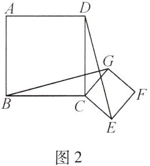 (2)当正方形$CEFG绕点C$在平面内顺时针旋转到如图2所示的位置时,线段$BG和ED$有何关系?写出结论并证明。
