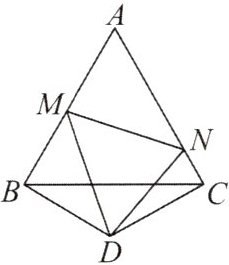 5.【变式练习】如图,$\triangle ABC$是边长为3的等边三角形,$\triangle BDC$是等腰三角形,且$\angle BDC = 120^{\circ}$。以点$D为顶点作一个60^{\circ}$角,使其两边分别交$AB于点M$,交$AC于点N$,连接$MN$,则$\triangle AMN$的周长为______