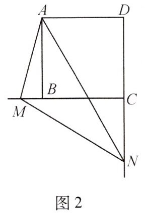 (2)当$\angle MAN绕点A$旋转到如图2所示的位置时,线段$BM$,$DN和MN$之间又有怎样的数量关系呢?请直接写出你的猜想。(不需要证明)