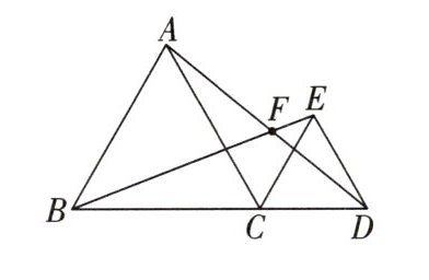 3. (RJ 九上 P76 改编)如图,$△ABC和△ECD$都是等边三角形,$△EBC可以看作是△DAC$经过平移、轴对称或旋转得到的. 说明得到$△EBC$的过程,并求$∠AFB$的度数.