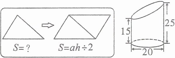 4.(湖北黄冈)我们曾经用下面的方法解决了求三角形面积的问题,用这样的经验,你能求出下面右图中这个几何体的体积吗?把你的想法画成草图标并列式计算。(单位:cm)