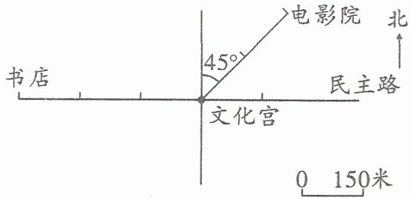 (1)如图,在文化宫东面300米处,有一条商业街与民主路互相垂直。在图上画直线表示出这条街,并标上“商业街”。(2分)