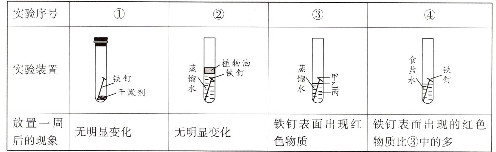 (1)③中甲、乙、丙三处比较,生锈最明显的地方是