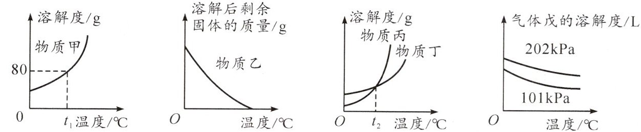 C. t₂℃时,丙和丁的溶解度相同