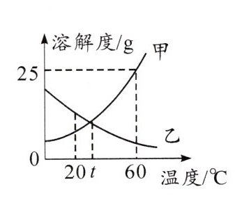乙;将60℃时甲、乙的饱和溶液分别降温至20℃,所得溶液中溶质的质量分数:甲>