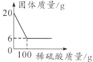 2. 铁铜金属粉末常用于生产机械零件。为测定某铁铜金属粉末中铁粉的质量分数,取20g样品于烧杯中,逐滴滴加稀硫酸,充分反应,测得固体质量与所加稀硫酸质量的关系如图。