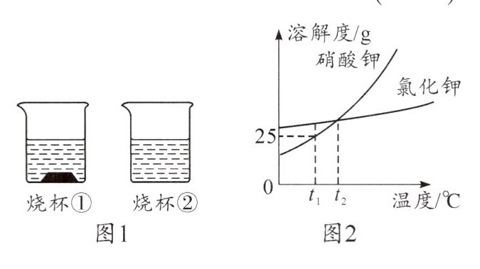 4. (2024·内蒙古)$t_{1}\ {{\hspace{0pt}}^{\circ }C}$时,将等质量的硝酸钾和氯化钾分别加入盛有$100\ {g}$水的两个烧杯中,充分搅拌后如图1所示,硝酸钾和氯化钾的溶解度曲线如图2所示。下列说法不正确的是 (