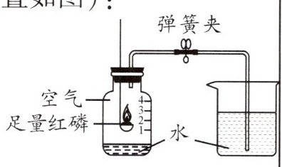 ,冷却后打开弹簧夹,烧杯内的水进入集气瓶中,进入水的体积即为瓶内消耗氧气的体积。红磷燃烧的文字表达式为:红磷+氧气$\xrightarrow{点燃}$五氧化二磷