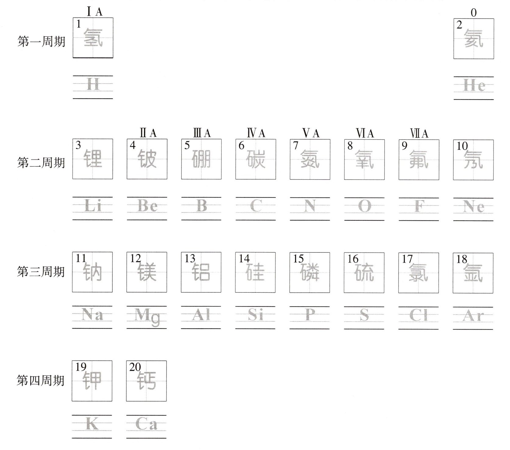2. 元素知识入门,按元素周期表中元素的位置,请临摹1~20号元素的名称和符号。