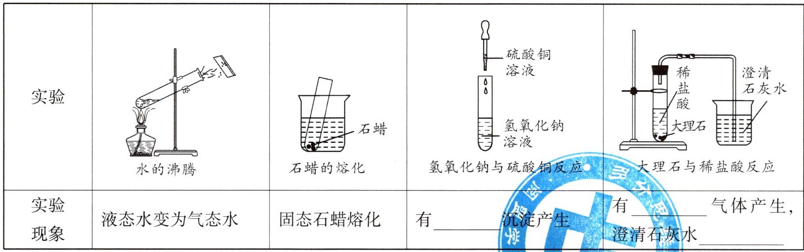的变化 || 变化举例 | 水的沸腾和水蒸气冷却、石蜡熔化、汽油挥发、铁水凝固 | 氢氧化钠与硫酸铜反应,大理石与稀盐酸反应、天然气燃烧、铁生锈、粮食酿酒 |