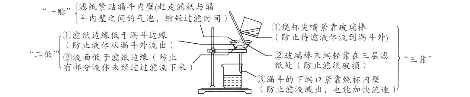 【注意事项】①过滤时不能用玻璃棒在过滤器中搅拌,以免弄破滤纸。