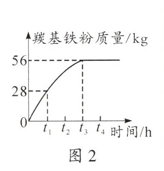 (3)反应2的化学方程式为$Fe(CO)_{5}\xlongequal{一定条件}Fe+5CO\uparrow$。196kg$Fe(CO)_{5}$分解生成羰基铁粉的质量随时间的变化如图2所示。在$t_{1}$时,剩余______