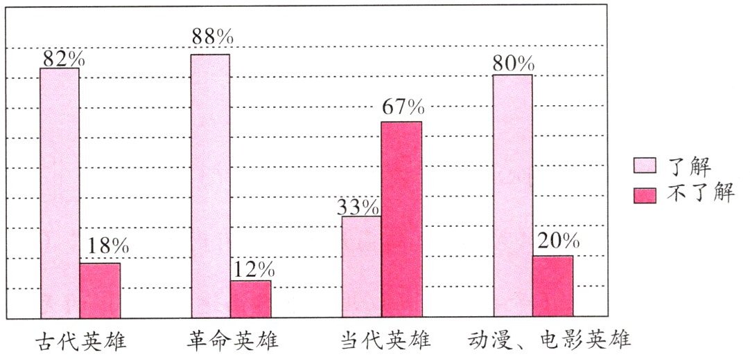 (1)当前中学生对古代英雄、革命英雄和动漫、电影英雄了解较多,对当代英雄了解较少。