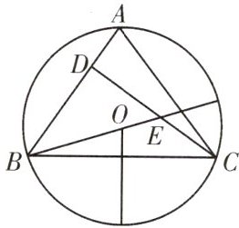 14.(2024·广州市二模)如图,$\odot O$是$\triangle ABC$的外接圆,$AB = AC$,$CD\perp AB$于点$D$,$BO$的延长线交$CD$于点$E$。