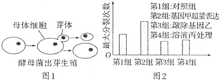 4.A [细胞周期包括分裂间期和分裂期,分裂间期主要进行DNA的复制和有关蛋白质的合成,由题干“出芽与核DNA复制同时开始”可知,芽殖酵母在细胞分裂间期开始出芽,A错误;由图2可知,基因甲和基因乙可提高芽殖酵母的最大分裂次数,而溶液丙可降低芽殖酵母的最大分裂次数,而每一个母体细胞分裂达到最大次数后就会衰老、死亡,因此基因和环境都可影响芽殖酵母的寿命,B正确;芽殖酵母通过出芽形成芽体进行无性繁殖,无性繁殖不会改变染色体的数目,C正确;一个母体细胞出芽达到最大次数后就会衰老、死亡,基因甲和基因乙可提高芽殖酵母的最大分裂次数,因此该实验结果为延长细胞生命周期的研究提供新思路,D正确。]