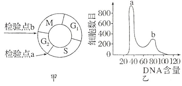 细胞周期是靠细胞内部精确地调控实现的,如果出现异常,就可能导致细胞的癌变。细胞周期可分为分裂间期和分裂期(M期),根据DNA合成情况,分裂间期又分为G₁期、S期(DNA合成)和G₂期。细胞周期受到检验点的严格调控,各检验点能对细胞周期的过程是否发生异常加以检测,只有当相应的过程正常完成,细胞周期才能进入下一个阶段运行。如图甲表示某动物小肠上皮细胞的细胞周期部分检验点,图乙表示根据肠癌细胞中DNA含量的不同,对细胞周期各时期细胞的计数结果。回答下列问题: