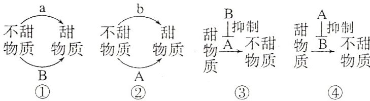 [典例 1] (2025·广东茂名调研)在种质资源库中挑选某二倍体作物甲、乙两个高甜度纯合品系进行杂交,$F_{1}$均表现为甜,$F_{1}$自交得到的$F_{2}$出现甜:不甜$=13:3$,假设不甜植株的基因型为$aaBB$和$aaBb$,如图中,能解释杂交实验结果的代谢途径有(