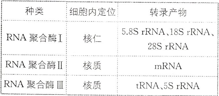 2. (2024·安徽卷,11)真核生物细胞中主要有 3 类 RNA 聚合酶,它们在细胞内定位和转录产物见下表。此外,在线粒体和叶绿体中也发现了分子量小的 RNA 聚合酶。下列叙述错误的是(