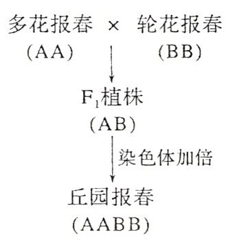 3.B [多花报春(AA)体细胞含有2×9 = 18(条)染色体,其芽尖细胞有丝分裂后期染色体数目为18×2 = 36(条),A正确;A、B分别代表两个远缘物种的1个染色体组,F₁植株中含有9对异源染色体,高度不育,不能产生正常的配子,B错误;利用秋水仙素或低温处理F₁幼苗,均可使其染色体数目加倍,获得丘园报春,C正确;丘园报春为异源四倍体,含有36条染色体,减数分裂过程中能形成18个四分体,D正确。]