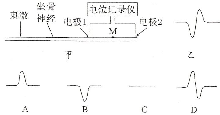 [例1] (2024·甘肃卷,9)图甲是记录蛙坐骨神经动作电位的实验示意图。在图示位置给予一个适宜电刺激,可通过电极1和2在电位记录仪上记录到如图乙所示的电位变化。如果在电极1和2之间的M点阻断神经动作电位的传导,给予同样的电刺激时记录到的电位变化图是 (