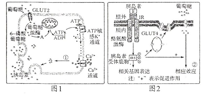 (2)图1中物质A表示__________,ATP敏感K⁺通道在ATP/ADP的值__________时会关闭,膜内电位发生的变化是________________________,导致Ca²⁺通道开放,Ca²⁺进入细胞内引起的效应①是__。