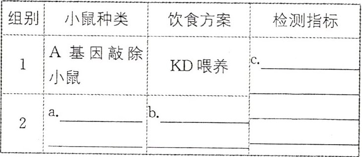 (4)分析题中信息,KD喂养的小鼠肺部黏液生成细胞数目高于普通饮食的小鼠肺部黏液生成细胞数目,而KD喂养的A基因敲除小鼠的检测结果与普通饮食的小鼠无显著差异,说明KD喂养条件下,A基因会影响小鼠肺部黏液生成细胞的数目。结合