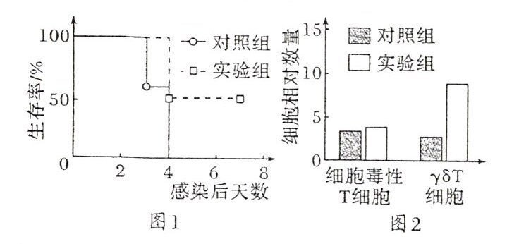 (2)根据题意,实验组的处理是KD喂养,对照组的处理是普通饮食喂养。图1结果显示,IAV感染三天后,实验组的生存率显著高于对照组,说明KD喂养可以增强小鼠抵抗IAV感染的能力。图2结果显示,实验组和对照组的细胞毒性T细胞数量无显著差异,而实验组的γδT细胞数量显著增多,推测γδT细胞在KD喂养增强小鼠抵御IAV感染能力方面发挥主要作用。