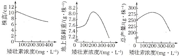 1. (2024·贵州卷,9)矮壮素可使草莓植株矮化,提高草莓的产量。科研人员探究了不同浓度的矮壮素对草莓幼苗的矮化和地上部鲜重,以及对果实总产量的影响,实验结果如图所示。下列叙述正确的是 (