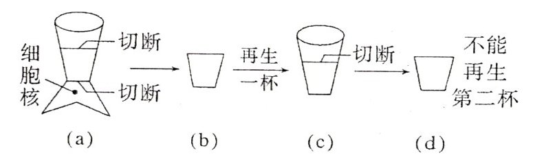 (2) 汉麦林的实验如下图,将单细胞的地中海杯状藻先在近核处切断,再在近杯处切断(a),中间的茎(b)置于海水中可再生一杯(c),但将此杯切掉后,不能再生第二杯(d)。对这个实验的解释合理的是________________________。