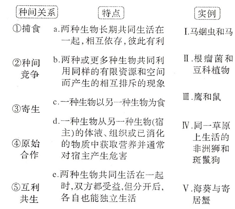 ③原始合作与互利共生的区别:前者是指对双方都有利的一种种间关系,但并没有发展到彼此相依为命的程度,如果解除这种关系,双方都能正常生存。而后者是物种之间不能分开的一种种间关系,双方分开后,会出现双方或其中一方不能正常生活的现象。