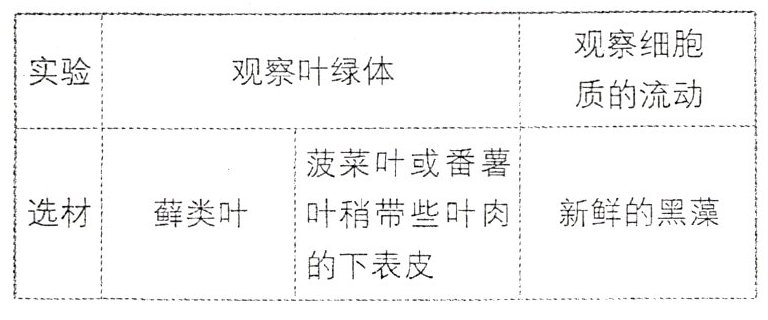 叶绿体:高倍镜下,不需染色,制片后直接观察,呈绿色、扁平的椭球或球形
