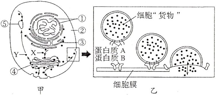 (4)研究表明,图甲中的Y囊泡内的“货物”为多种水解酶,这些酶会储存在结构⑤中,推断结构⑤是什么?由内质网、高尔基体加工的蛋白质一定是分泌蛋白吗?
