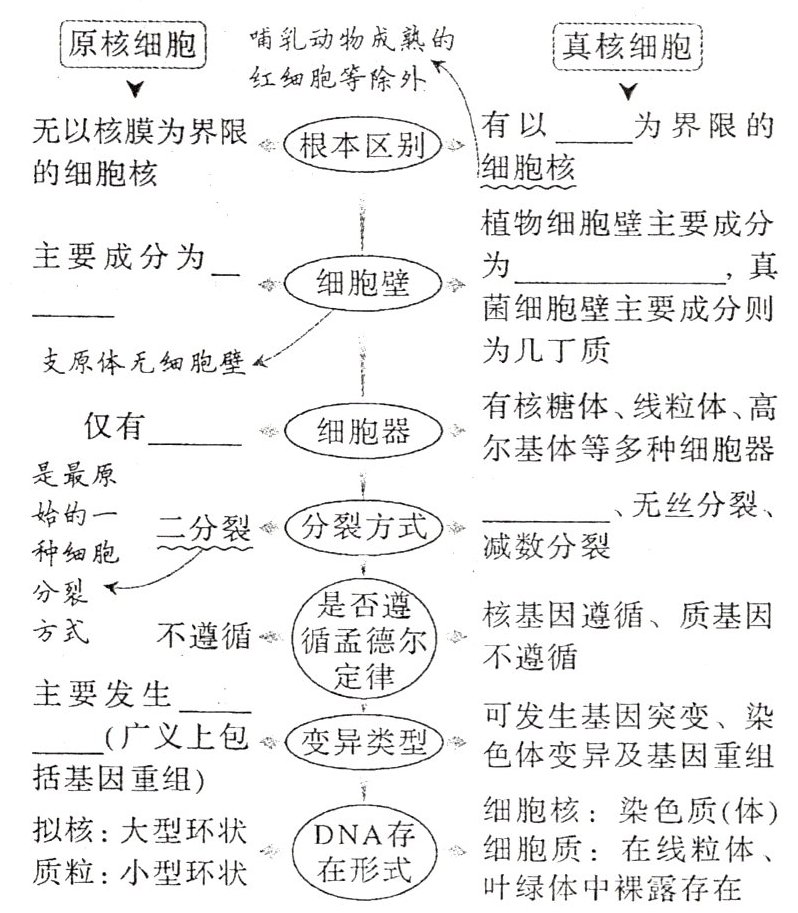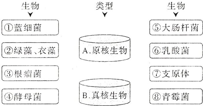 (2)a.大肠杆菌 支原体 b.拟核 细胞壁 鞭毛 细胞膜 核糖体 以核膜为界限的细胞核 核糖体 c.其细胞中含有藻蓝素、叶绿素及光合作用所需的酶 细胞壁 d.核膜 肽聚糖 纤维素和果胶 核糖体 有丝分裂 基因突变
