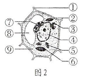 图2:植物细胞(有①细胞壁、②细胞膜、③细胞质、④细胞核、⑤叶绿体、⑥线粒体、⑦液泡、⑧内质网、⑨高尔基体)