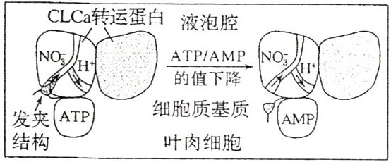 ATP与CLCa蛋白结合稳定了发夹结构,堵塞了$NO_{3}^{-}$转运通道,导致CLCa蛋白不能运输$NO_{3}^{-}$,所以ATP/AMP的值上升不利于AMP与CLCa蛋白竞争性结合进而发挥转运活性,B正确,C错误。